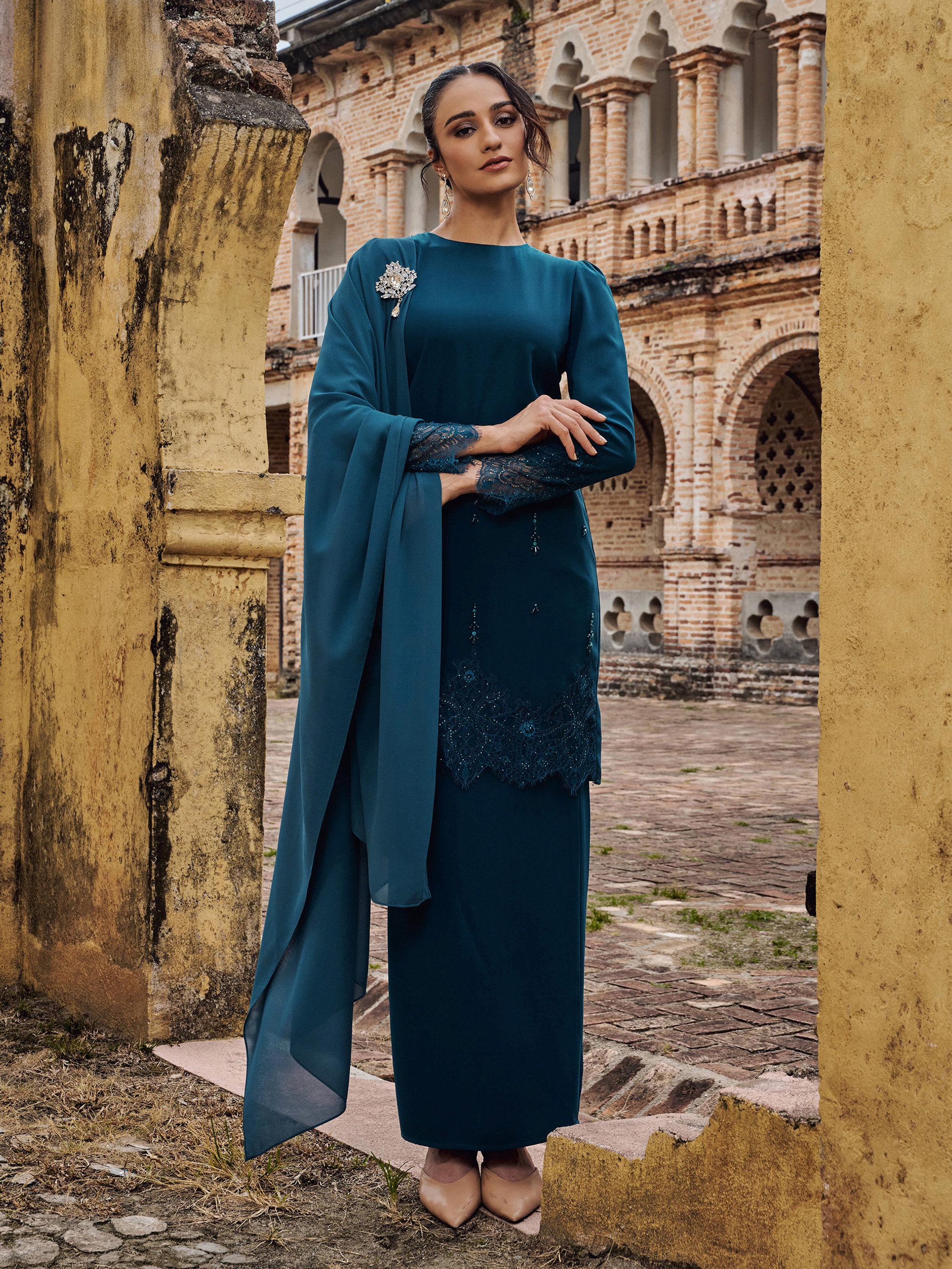 Chalia Kurung is crafted from soft moss crepe, offering a smooth and elegant drape. The bodice features hand-sewn tassel bead detailing, adding subtle movement and charm. The hemline and sleeves are adorned with patch embroidery lace, beautifully accented with crystal embellishments for a refined, luminous finish.
