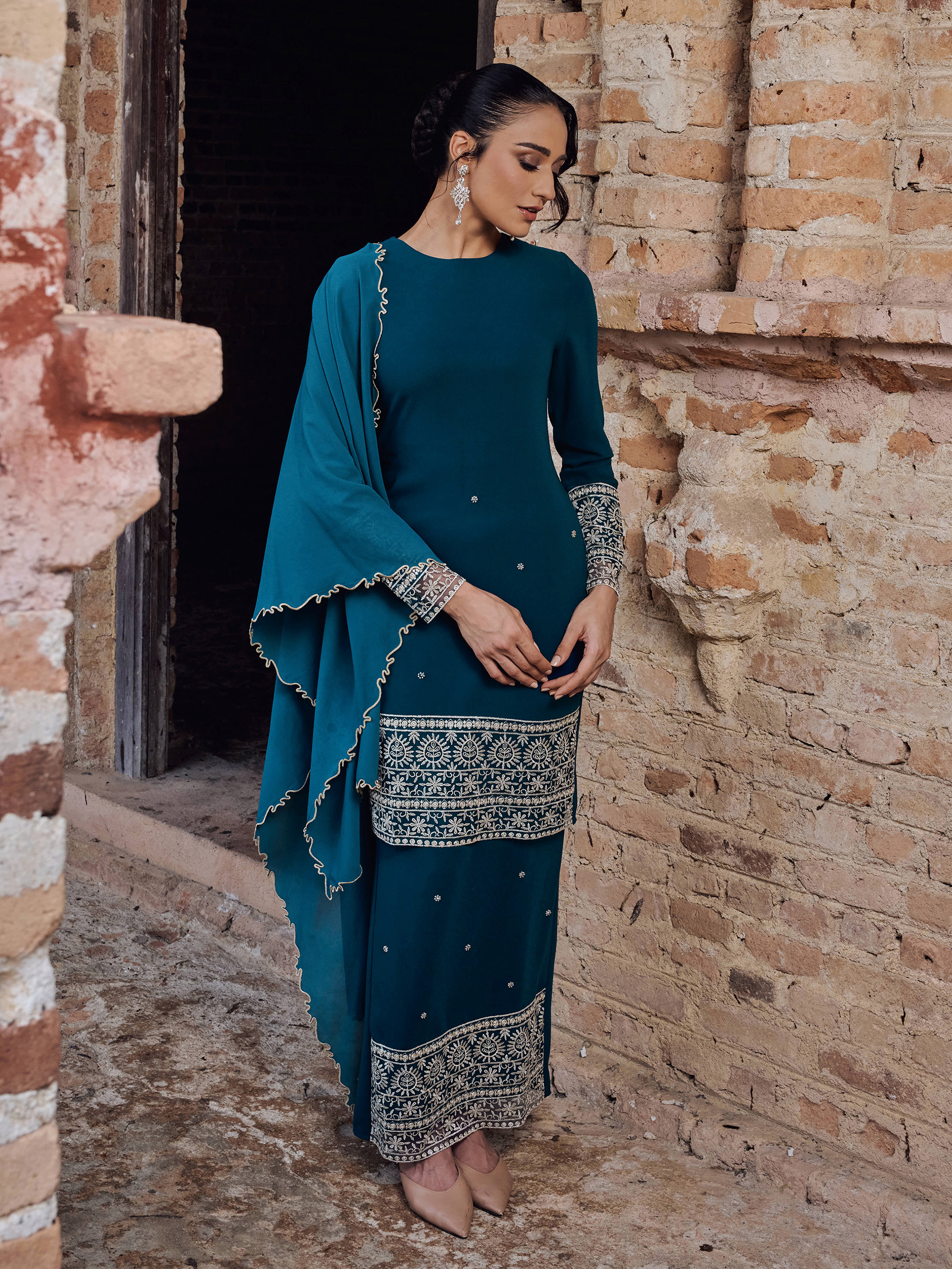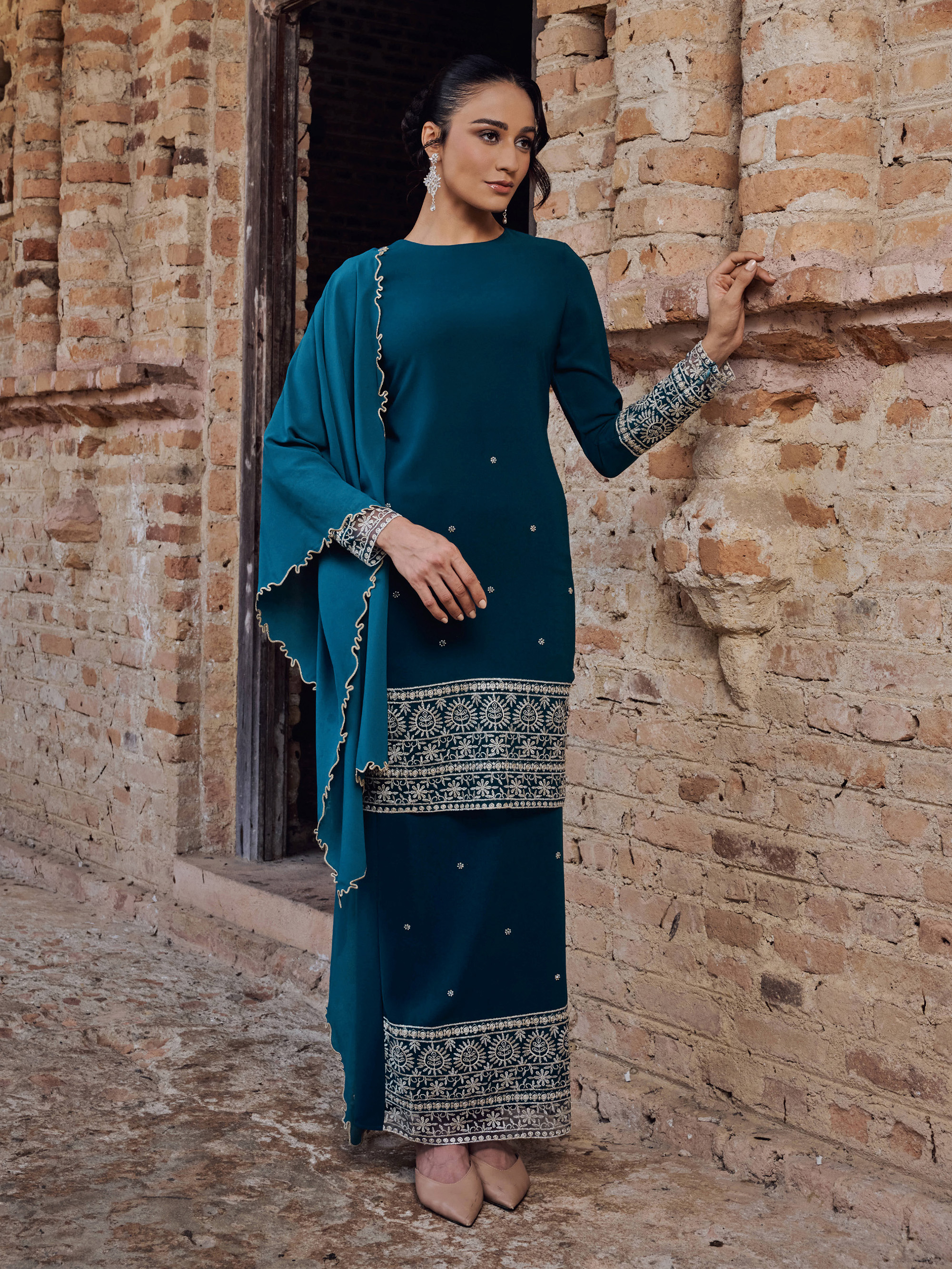 Embun Kurung is crafted from moss crepe, offering a smooth and structured drape. The design features intricate extended embroidery lace along the hemline, sleeve and skirt as finishing, adding refined detail and texture. Scattered crystal accents across the bodice lend a subtle sparkle, while the matching embroidered skirt panel creates a cohesive, elegant look.