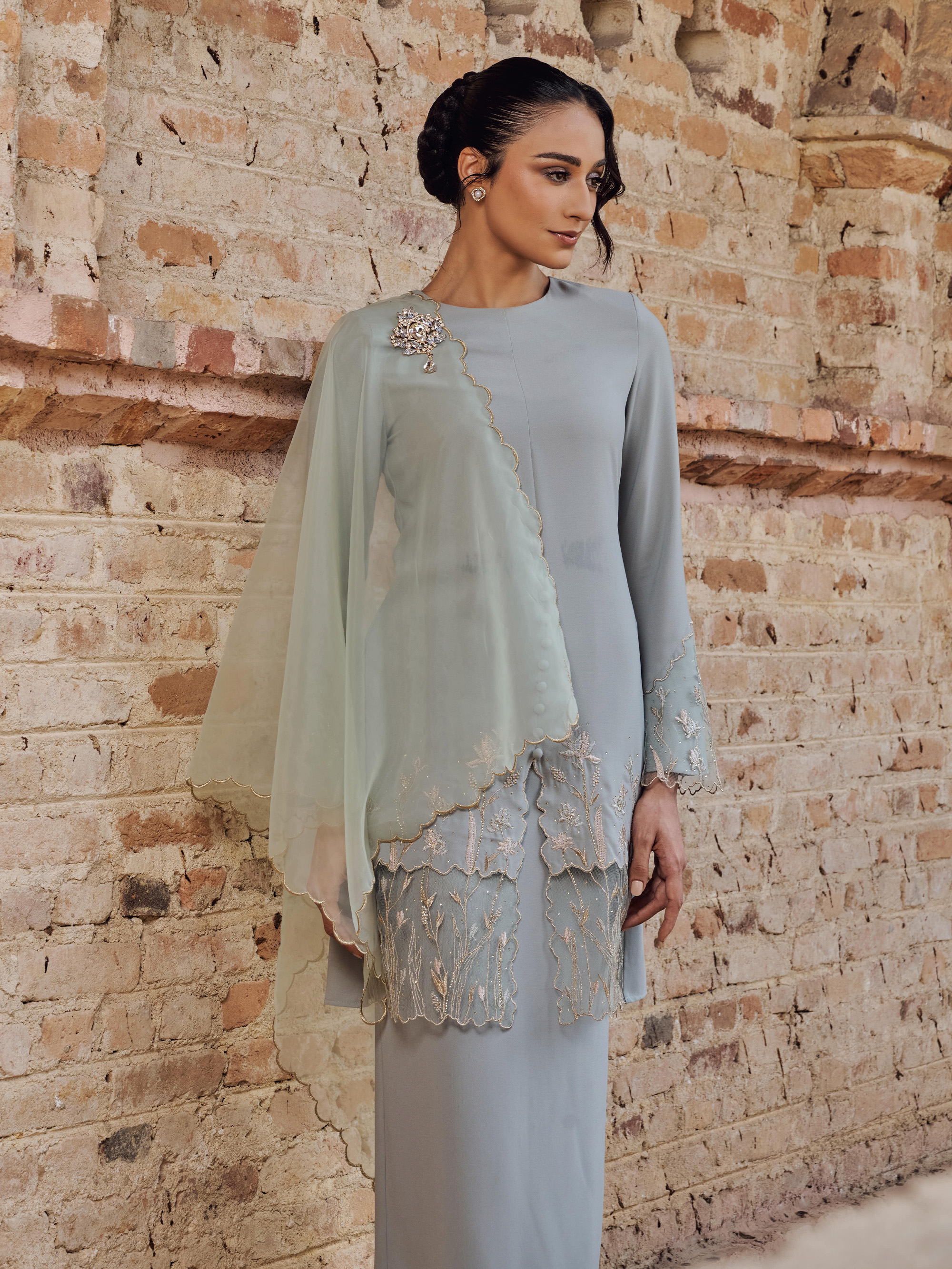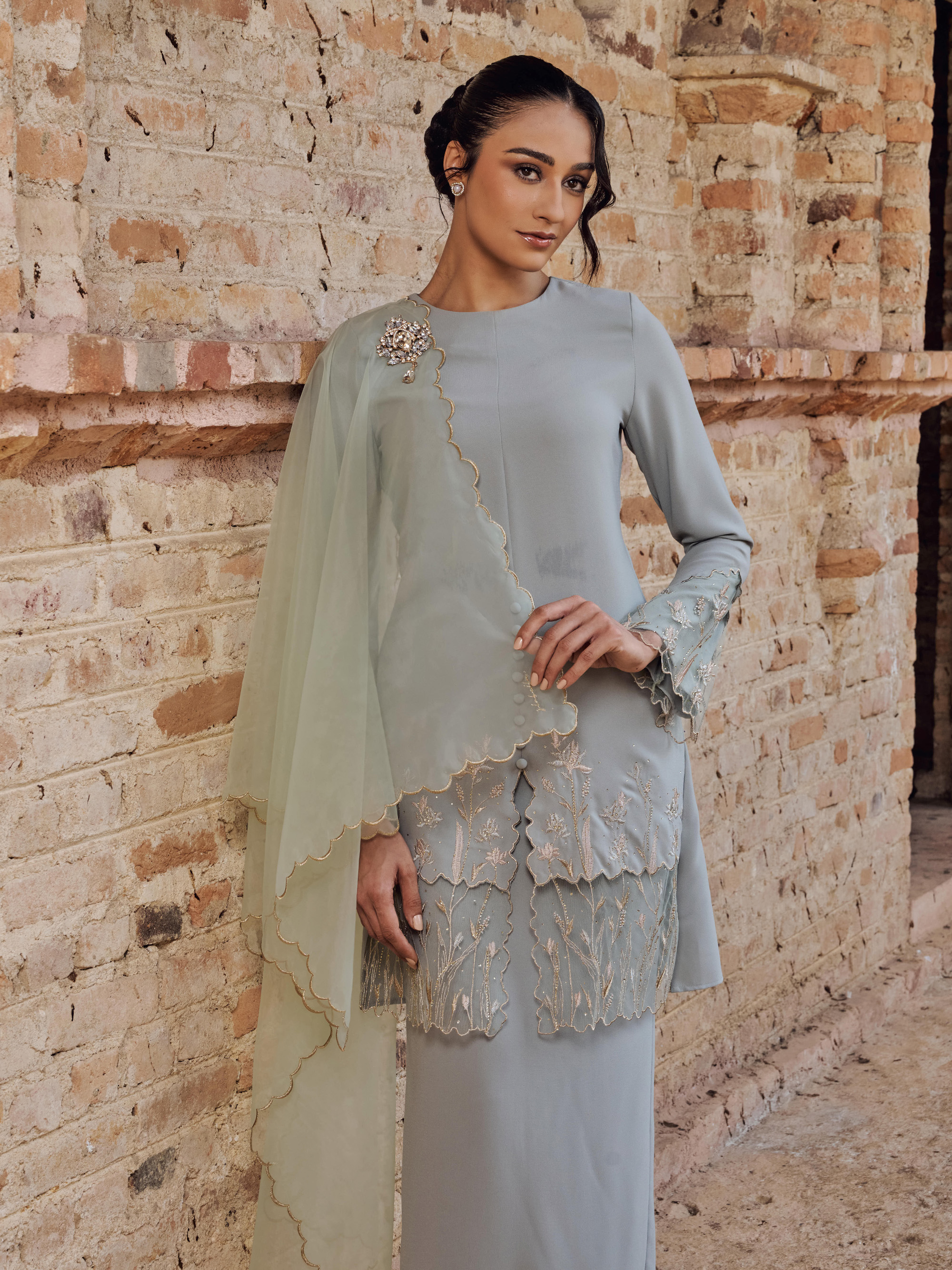 Wardani Kurung is made from moss crepe, featuring delicate floral embroidery lace along the hemline and cuffs for a touch of elegance. The front is accentuated with covered buttons, adding a refined traditional detail. The scalloped embroidery edging enhances the soft, feminine silhouette, while the straight-cut skirt completes the look with timeless sophistication and modern charm.